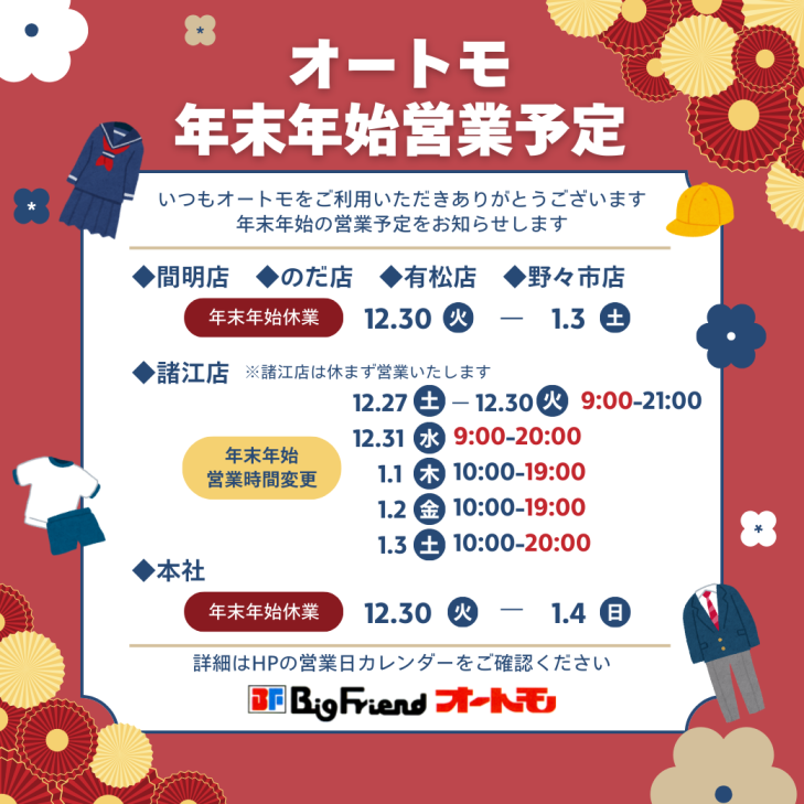 誠に勝手ではございますが、下記の日程は年末年始休業及び営業時間変更とさせていただきます。
